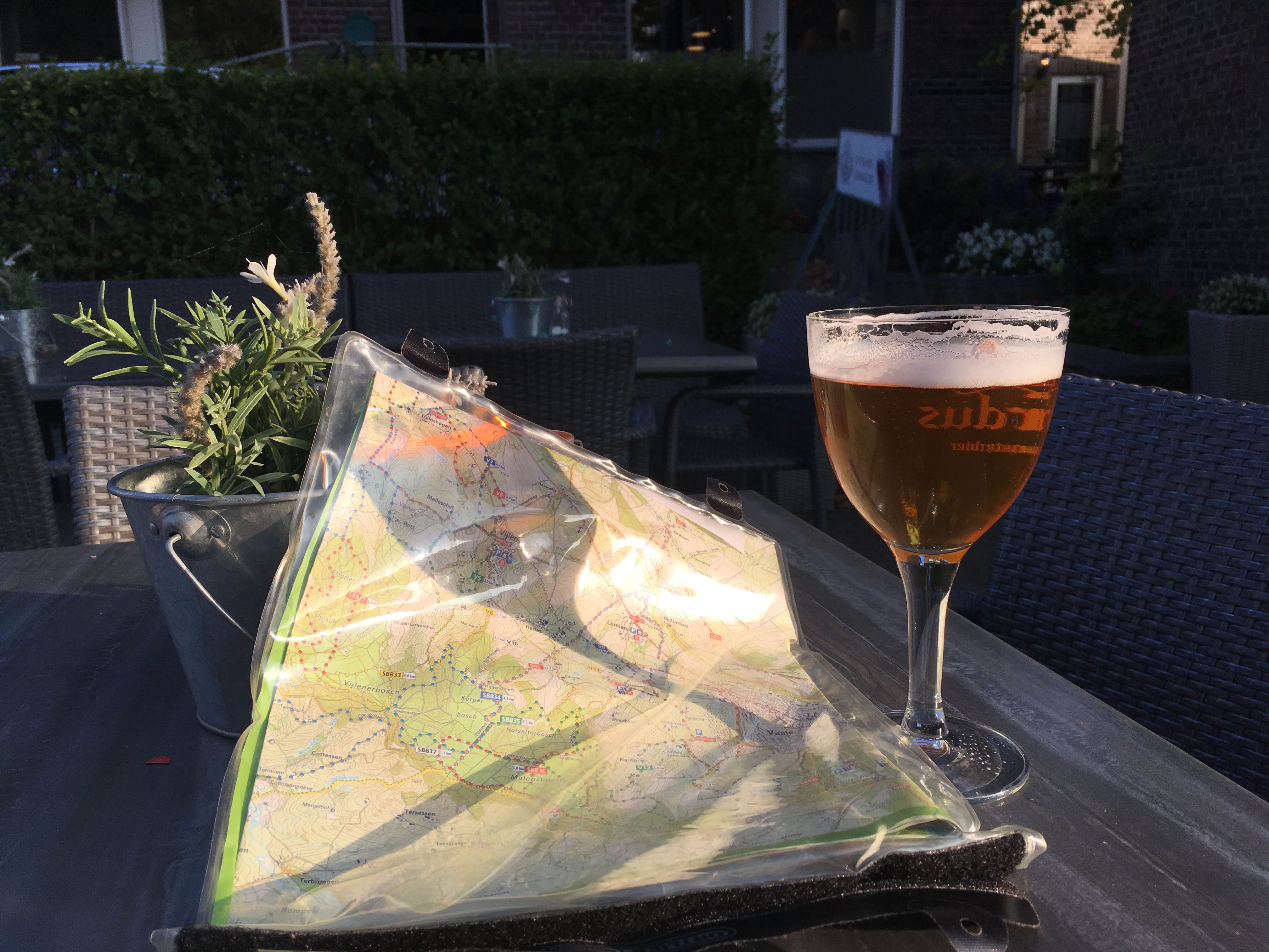 Een terras gepakt, Gerardus Triple biertje, en dan het bos in.