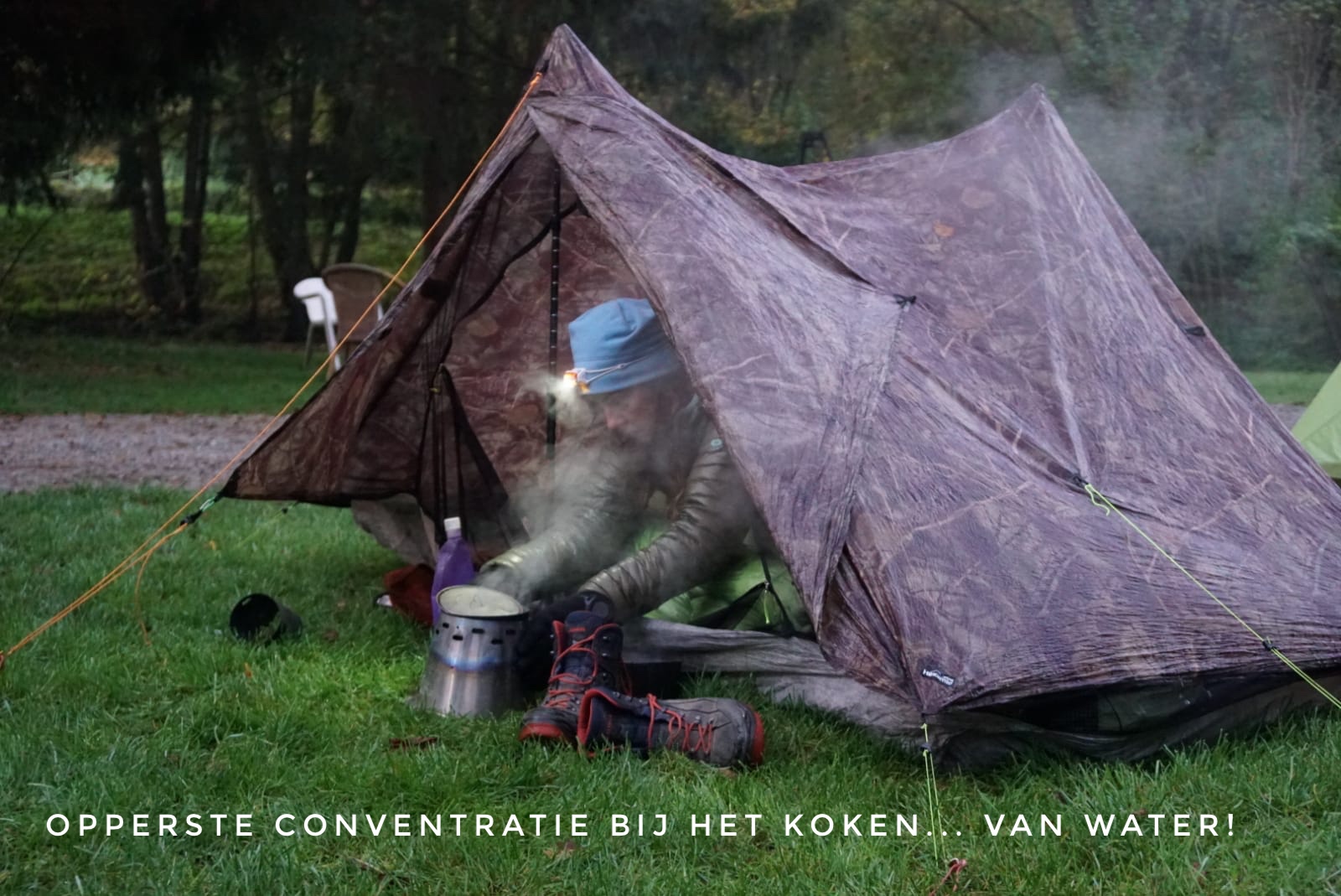 ‘s Avonds kampvuur en veel lagen aan, en met een met-warm-water-gevulde drinkflessen als kruik de slaapzak in.