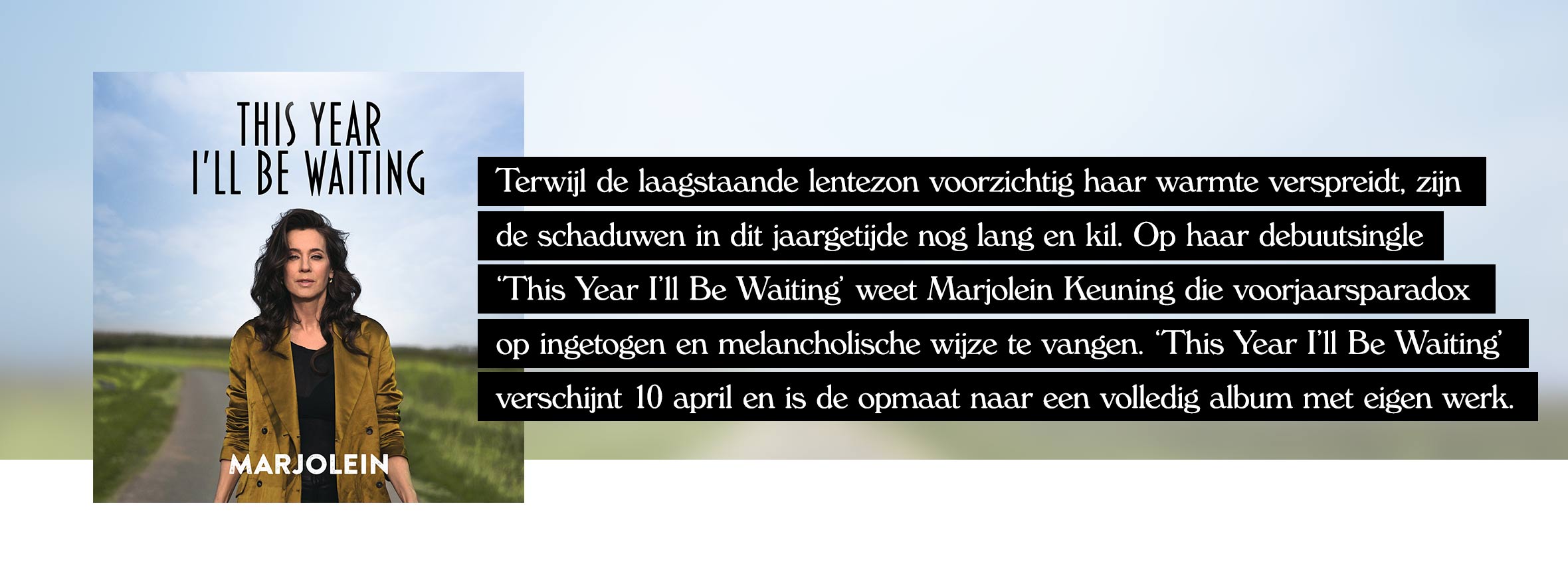 Op ‘This Year I’ll Be Waiting’ koppelt Marjolein Keuning het verlangen naar de warmte van de lentezon aan twijfels over de staat van onze planeet en het eigen bestaan. “We gaan ervan uit dat het vanzelf weer lente wordt, dat er altijd weer een nieuw jaar komt, dat betere tijden achter de horizon liggen. Maar wat als dat niet zo is?” Sinds ze meer met de seizoenen leeft en ziet hoe moeder natuur wankelt, is de kijk van Marjolein op de vanzelfsprekendheid van het leven veranderd. “Daar bovenop kwam bij mij de diagnose borstkanker, waardoor je ineens wordt geconfronteerd met de mogelijkheid dat er misschien ook voor jezelf geen volgende lente meer komt”, zo stelt ze. “En hoewel de operatie succesvol was, doet dat besef wel iets blijvends met je.”