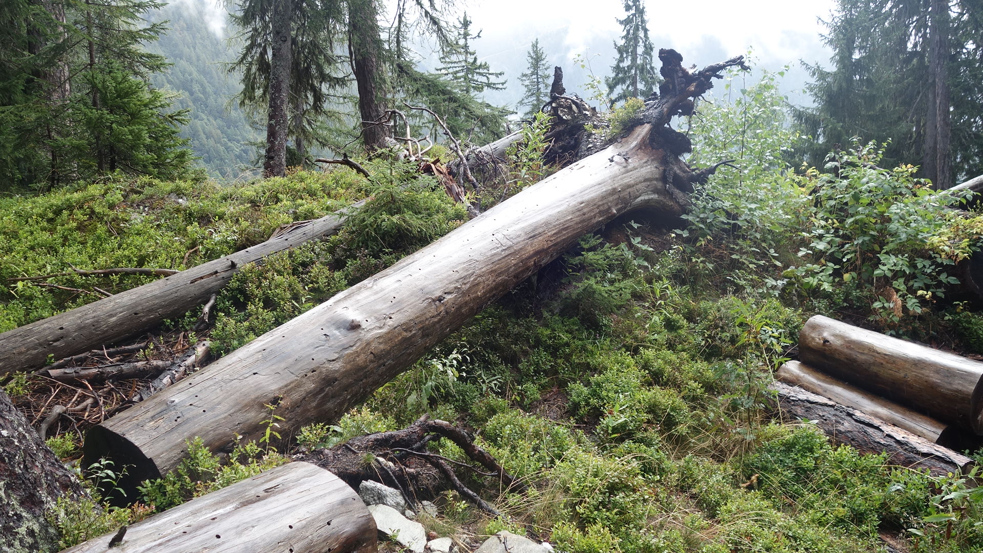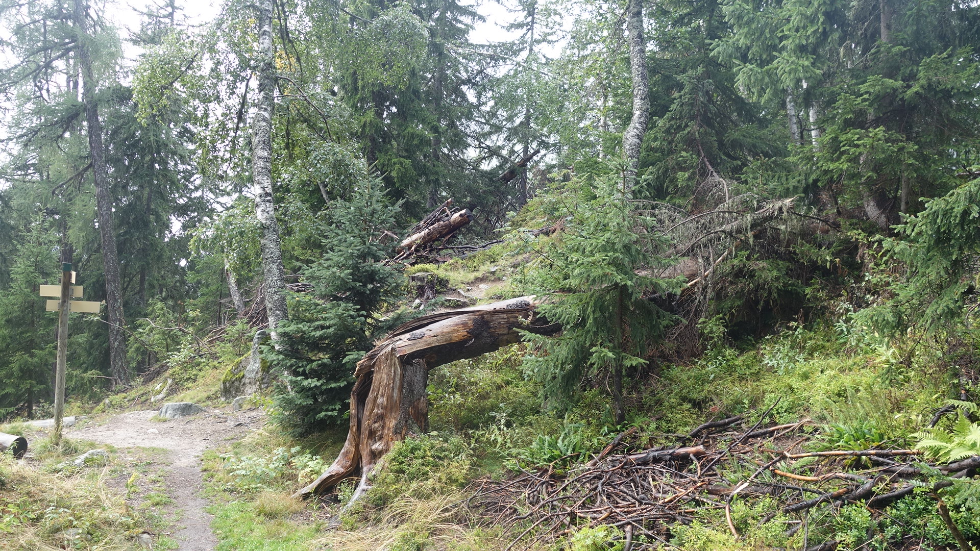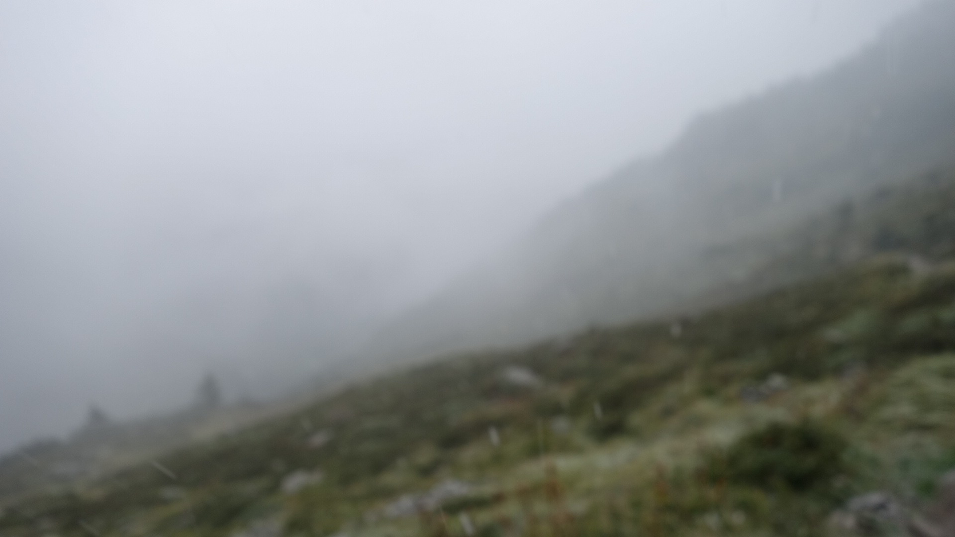 Eerst door een bos: regen, toen boven de boomgrens, is dat hagel of natte sneeuw? en toen de laatste meters naar de col de Balme. Ipv 2.5 uur vlg de gids was ik er in nog geen 2 uur: ik krijg al een beetje bergbenen!